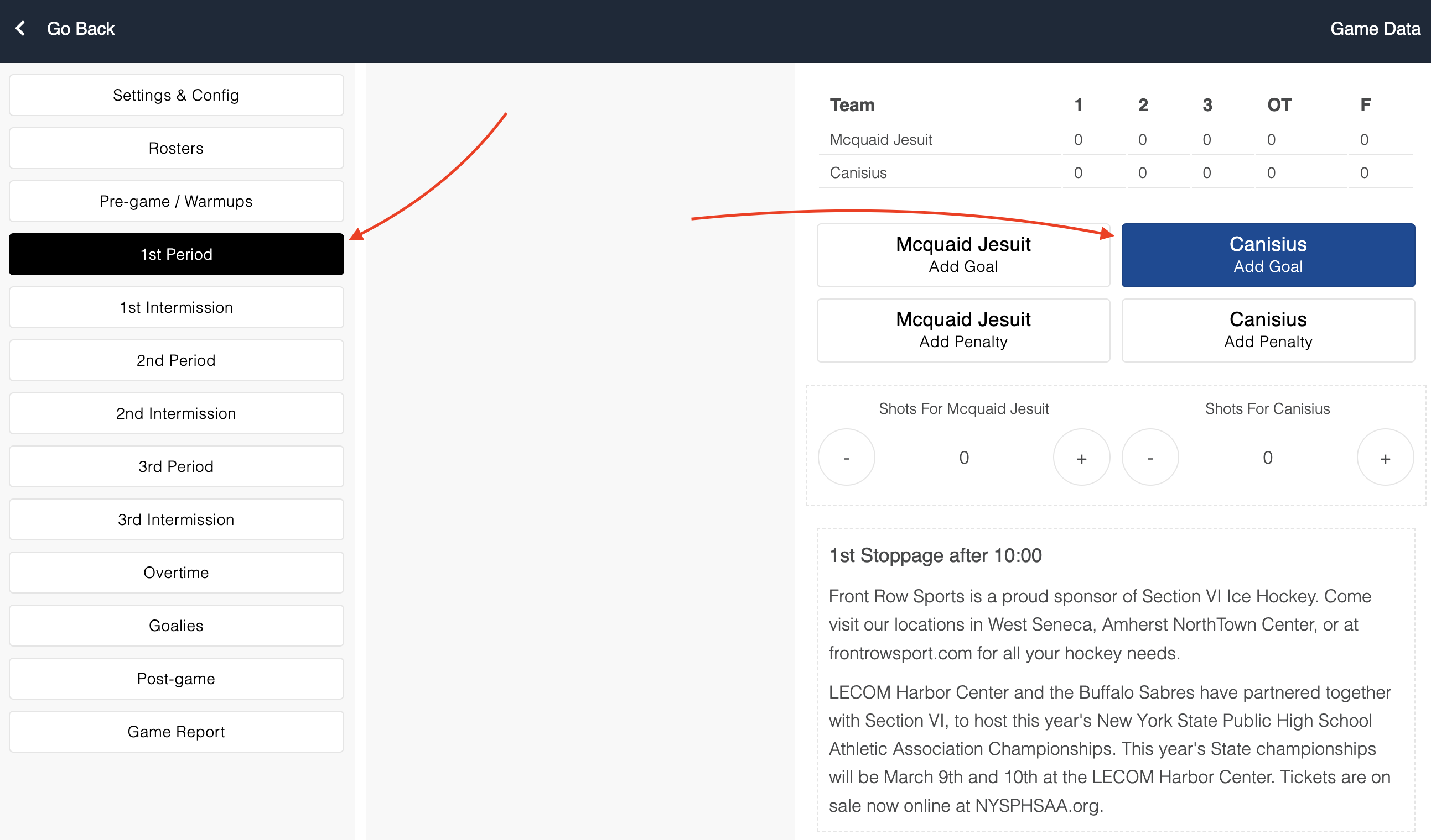 Within one of the period tabs, there are two buttons to add a goal. One for the home team and one for the away team.