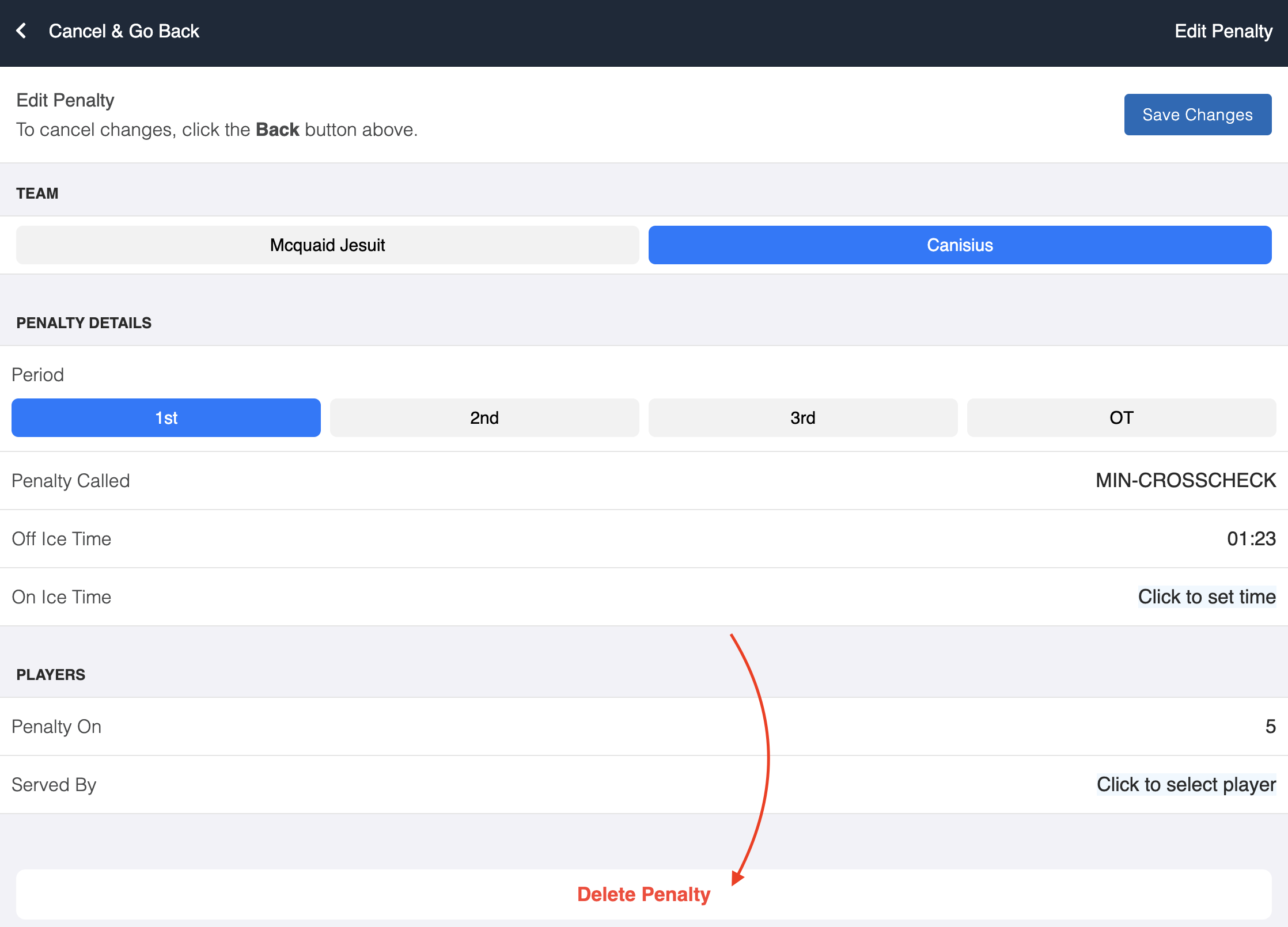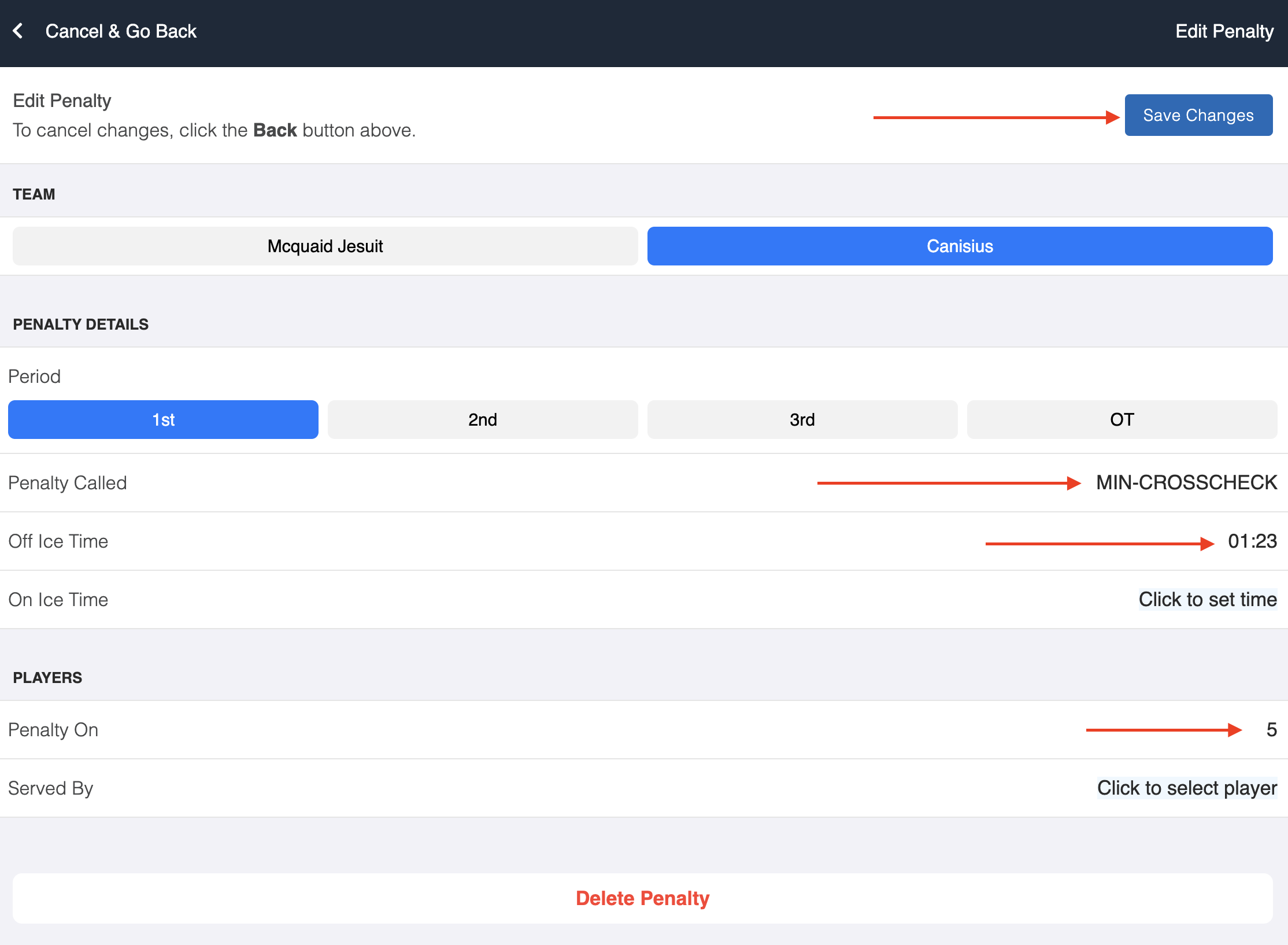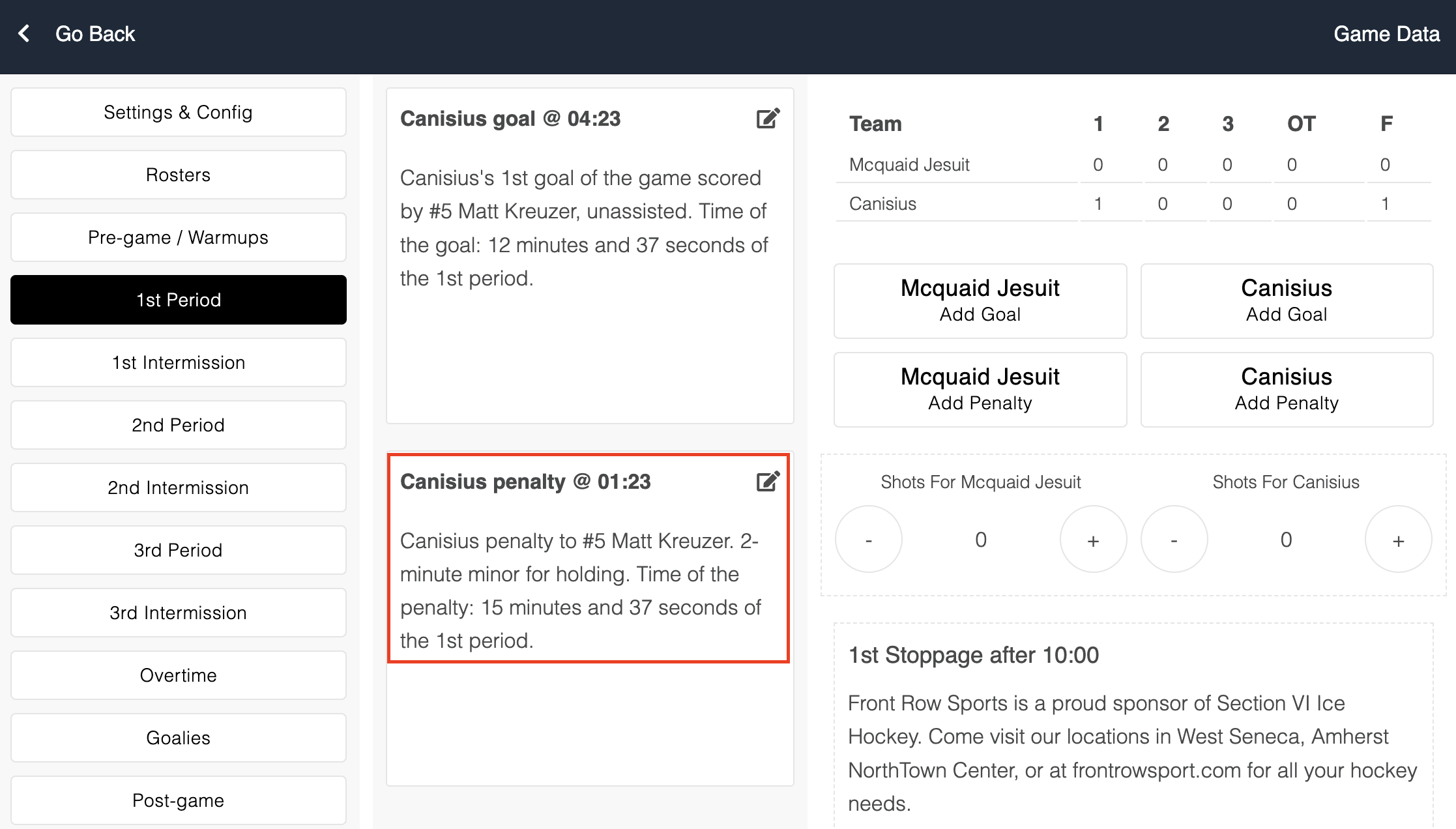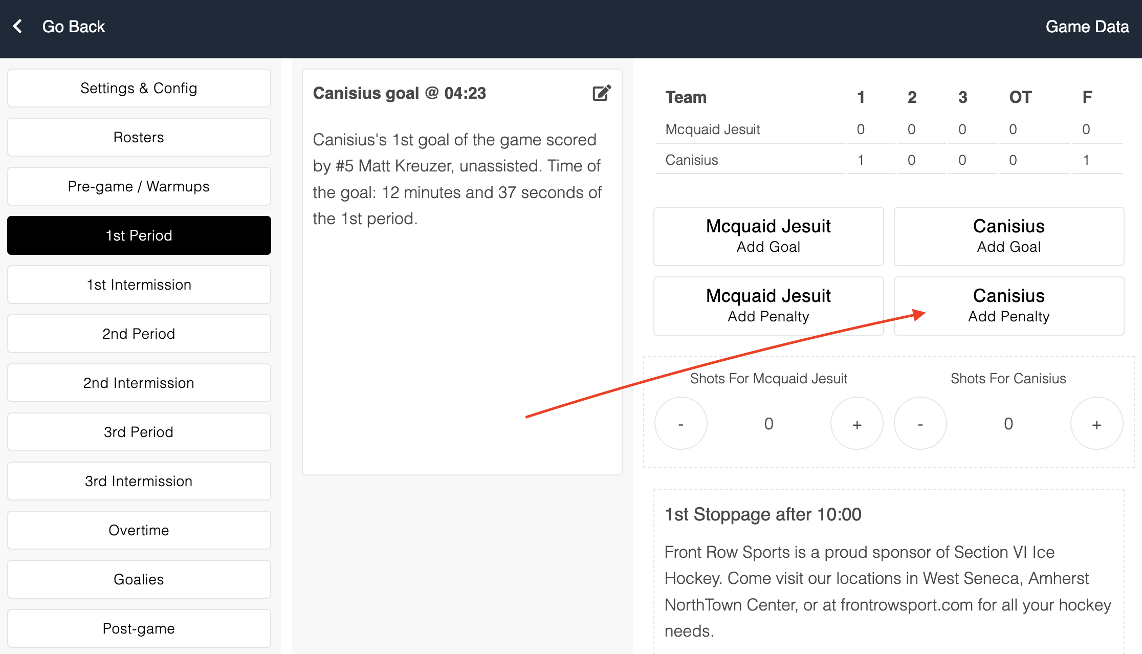 Within one of the period tabs, click the appropriate “Add Penalty” button for the home or away team.