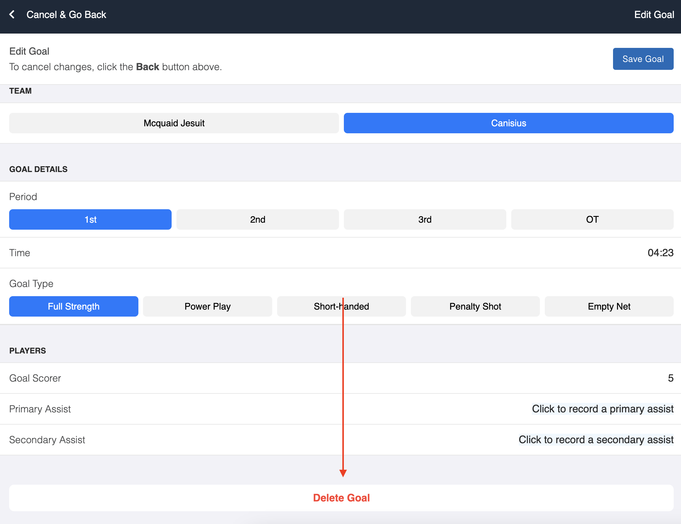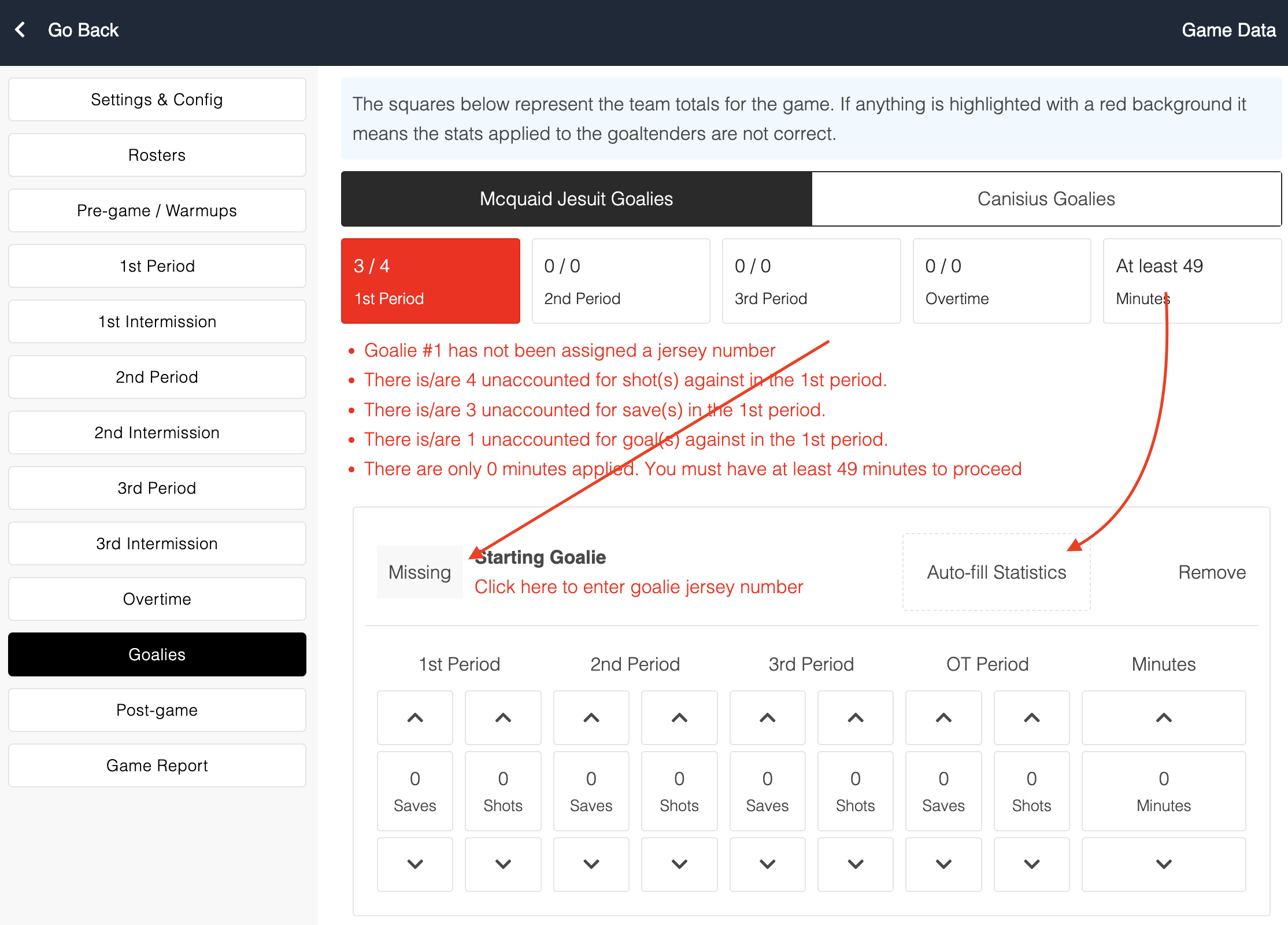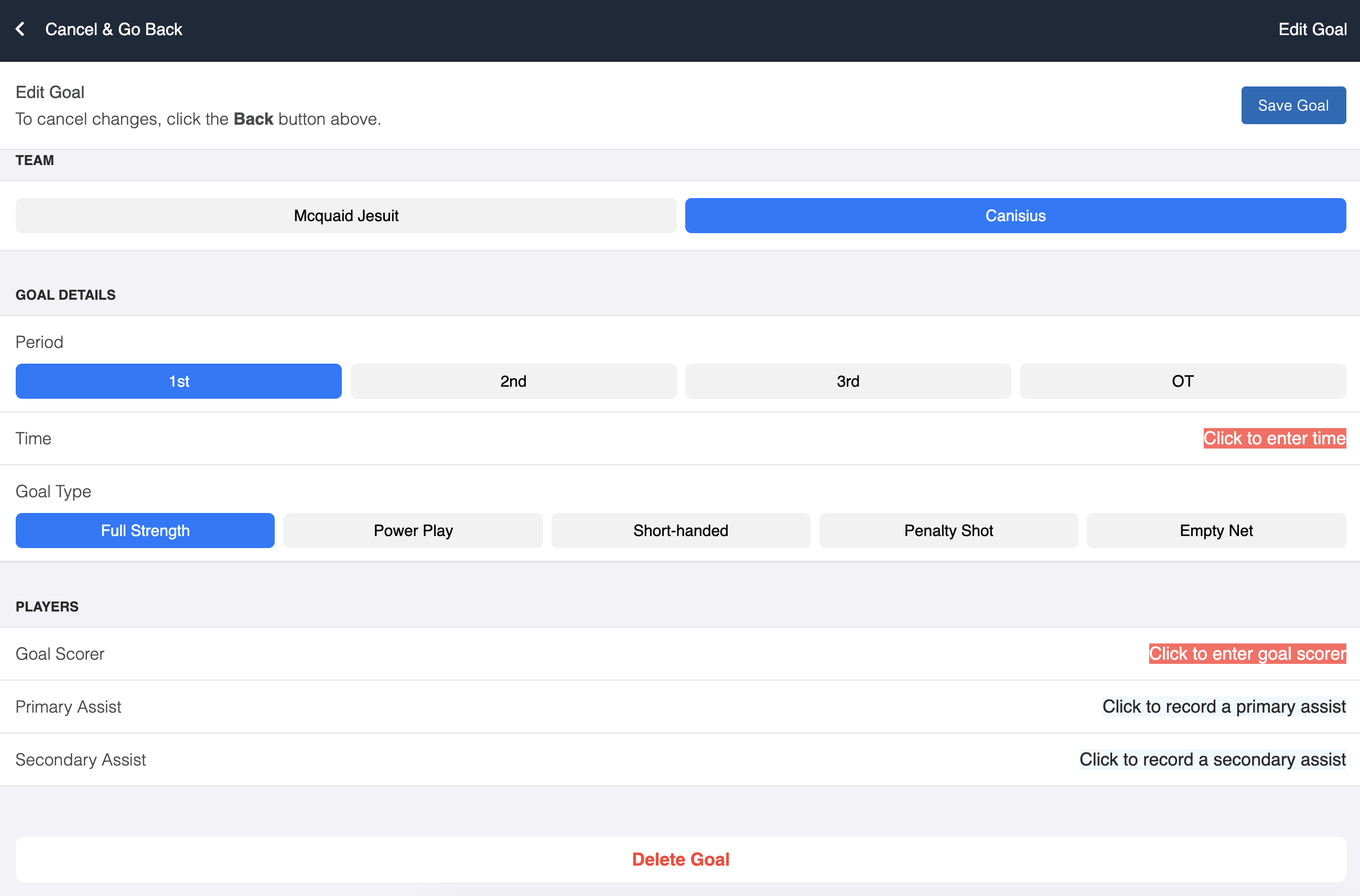 If multiple goalies played in the game, click the blue "Add Goalie" button (located beneath the starting goalie section)
