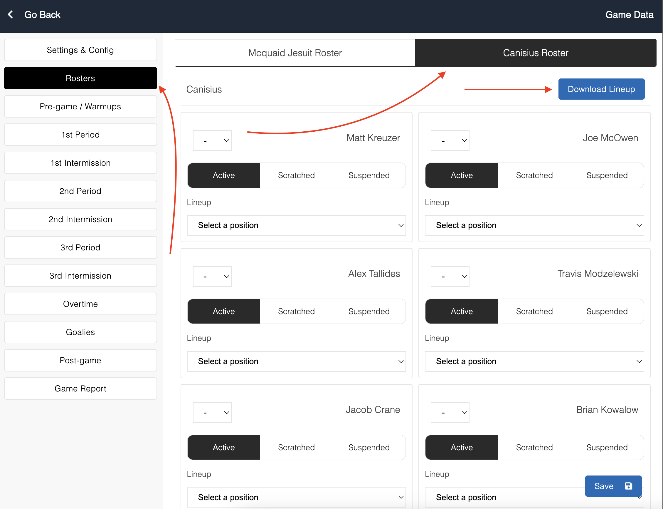 If WiFi is available within the rink the scorekeeper should, at this point, toggle to both teams and click the blue “Download Lineup” buttons.