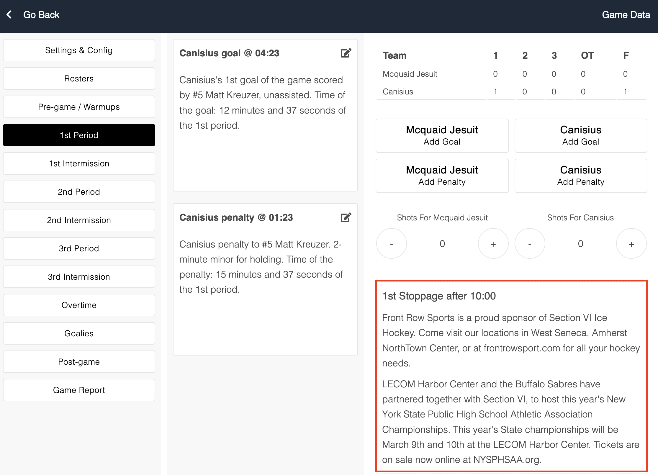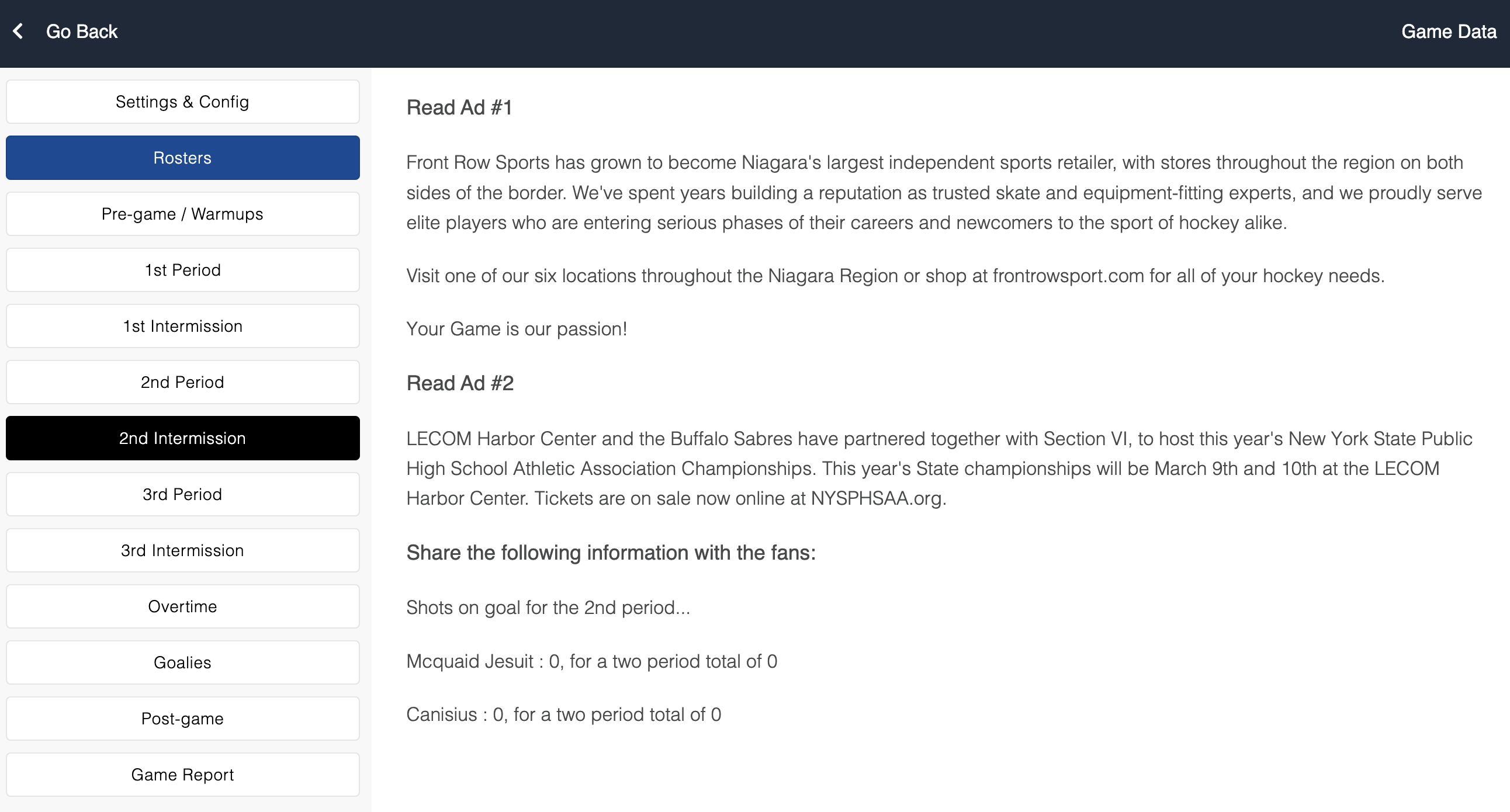 During intermissions there will be two advertisements to read; afterwards, the system will provide you with the shots on goal announcement.