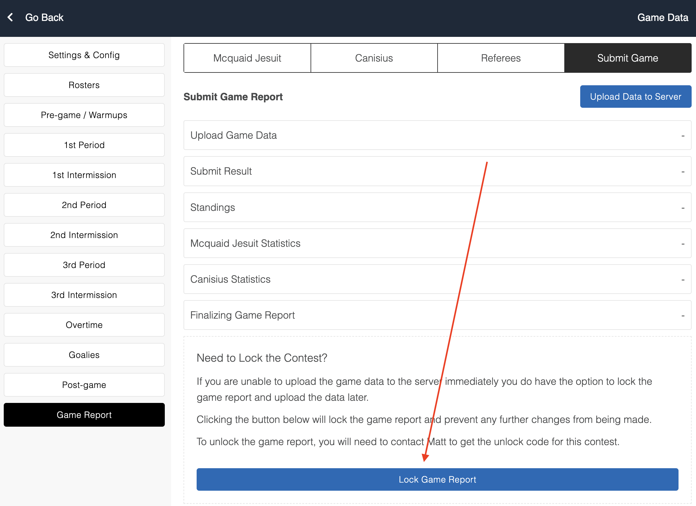 Clicking the blue "Lock this Contest" button will ensure the only action that can be taken from that point on is the ability to upload the game data to the server.