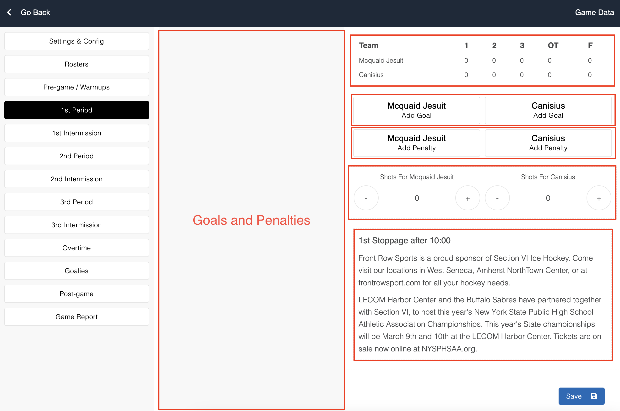 On the right column you will see the boxscore, buttons to add goals, penalties for the home/away teams, and four shot buttons (plus/minus for home/away teams)