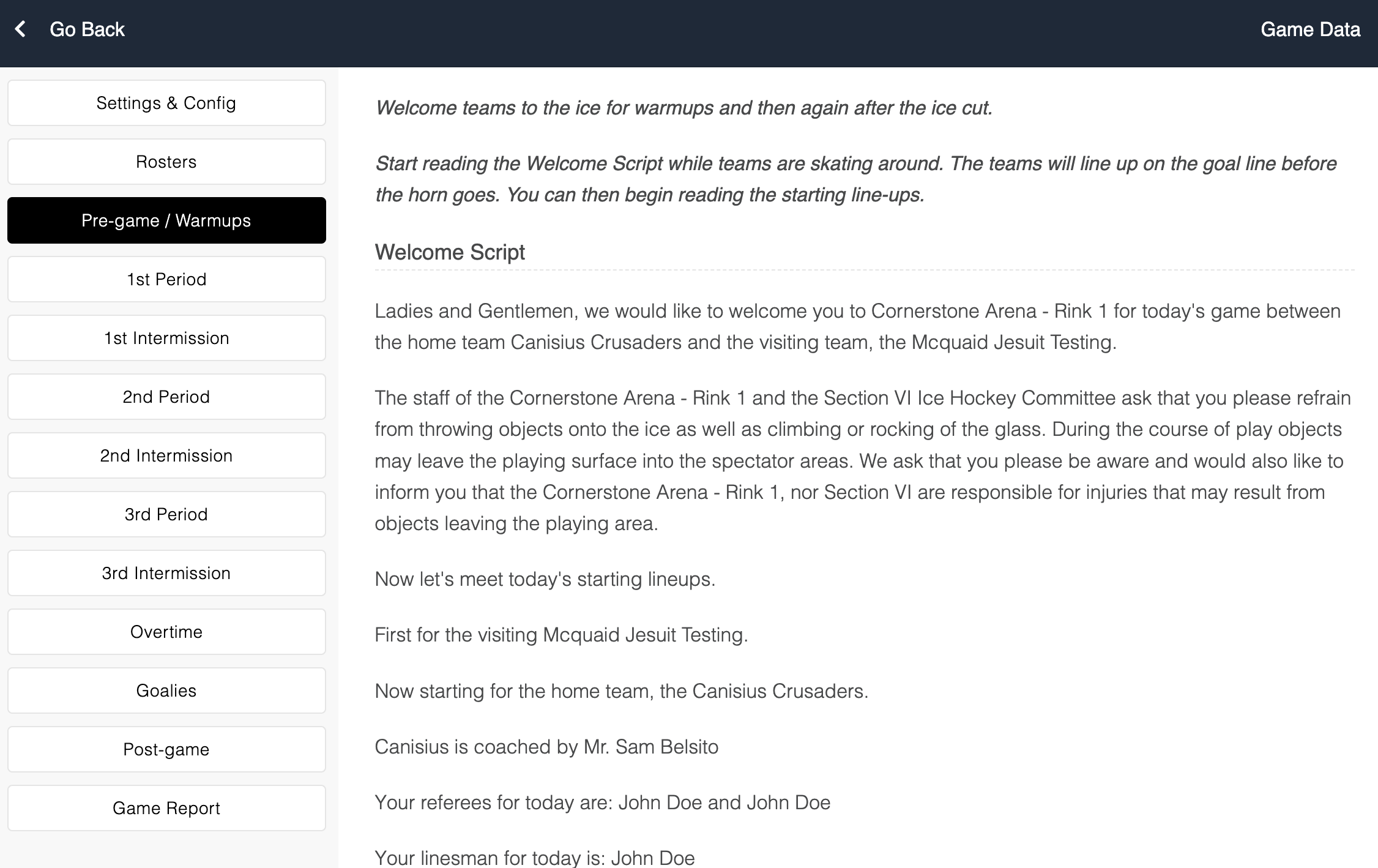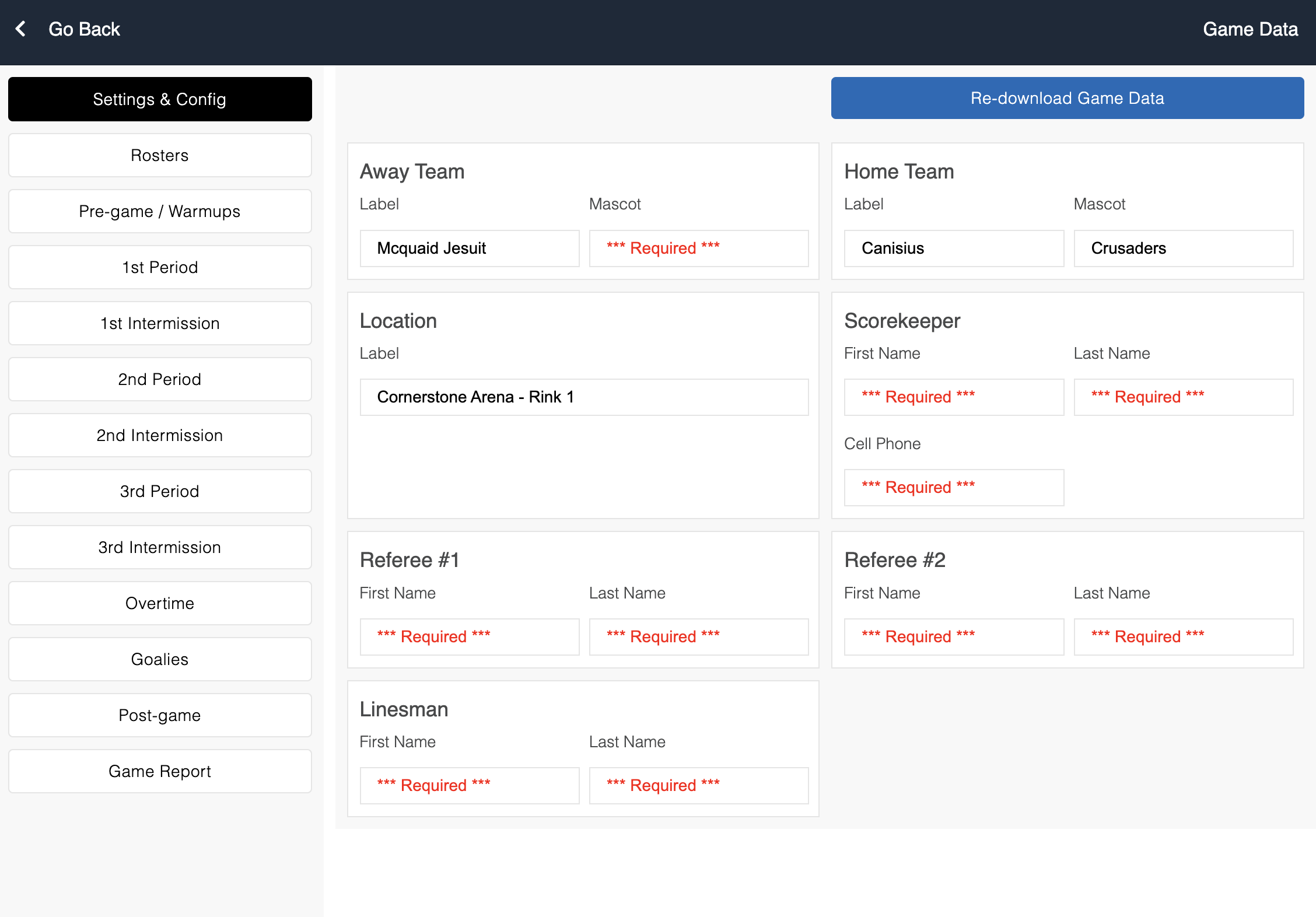 The app will not allow the scorekeeper to proceed to the Pre-game / Warmups phase without completing this information since this information is required within the pre-game welcome script.