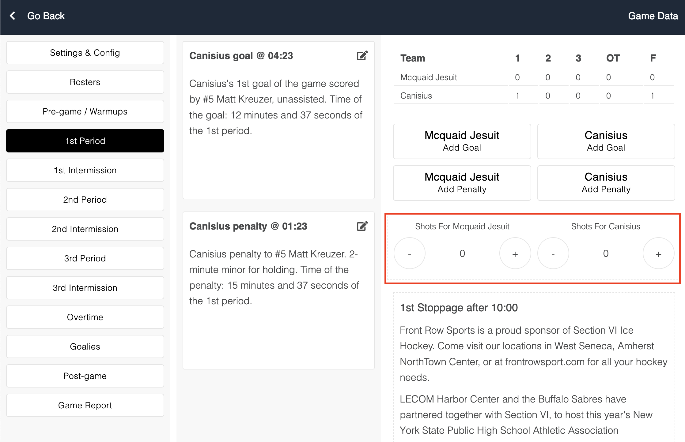 Inside of each period tab there four buttons (plus/minus for both the away/home teams) that will allow you to control the shot count.
