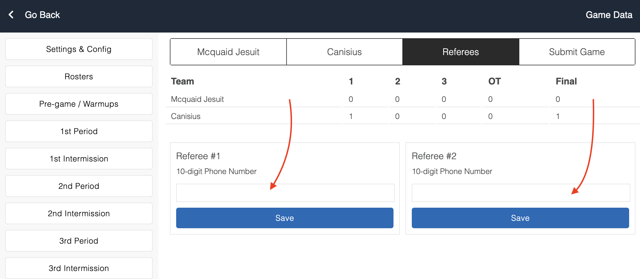 After goalie stats have been recorded for both teams, click the "Game Report" button and select the "Referees" tab.