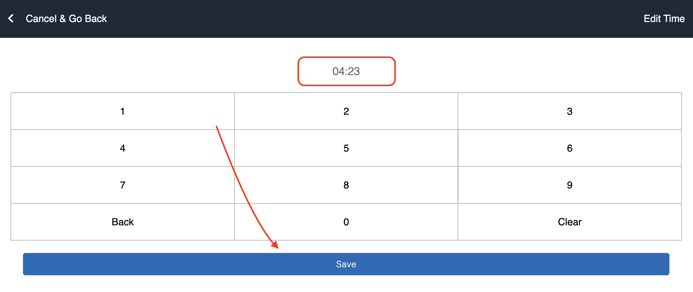 After punching in the time, click the blue "save" button. If you made a mistake you can click the “Cancel & Go Back” link in the top left corner.